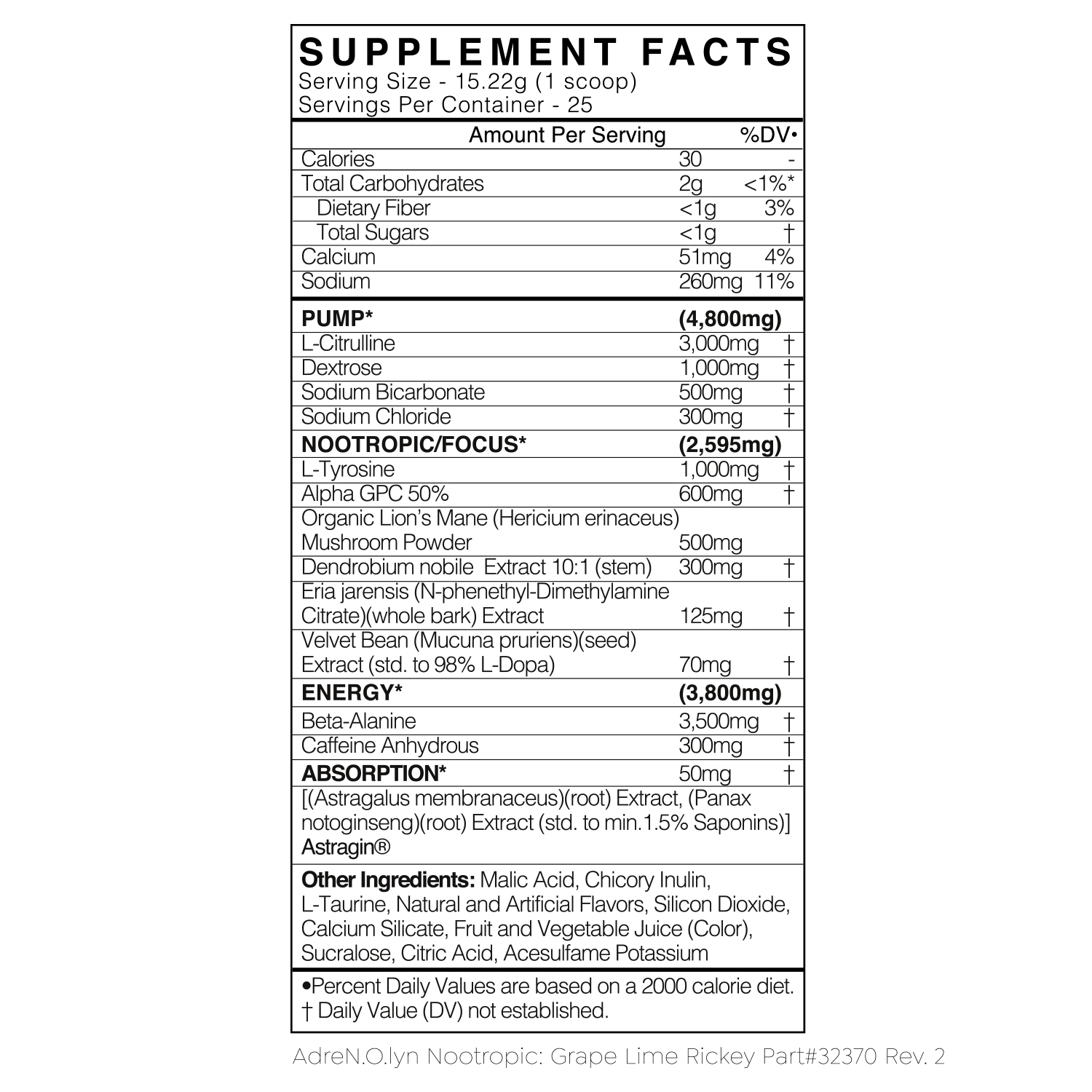 Featured Ingredients: Beta Alanine, L-Citrulline, Alpha GPC 50%, L-Tyrosine, Lion's Mane (Mushroom), Dendrobium Nobile Extract 10:1, Velvet Bean Extract, 300mg Caffeine Anhydrous.