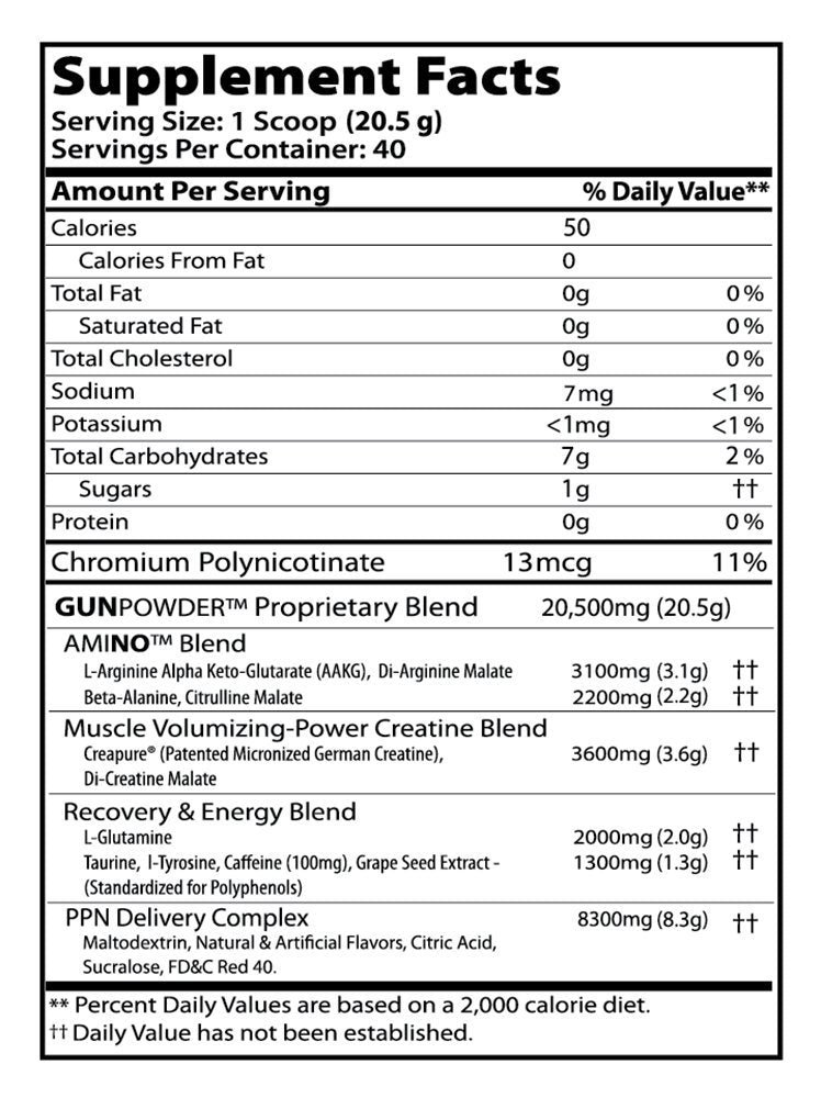 Gunpowder® combines over 20 grams per serving of the highest pharmaceutical quality and most advanced Nitric Oxide (NO) enhancer's. In addition to Arginine Alpha-Ketoglutarate (AAKG), it also contains PPN's Elite Creatine (Micronized German Creapure®), Glutamine (Pharmaceutical Quality Ajinomoto® Brand), Beta Alanine and several other key ingredients that produce the most powerful, best tasting Nitric Oxide strength, growth and performance enhancer on the market.