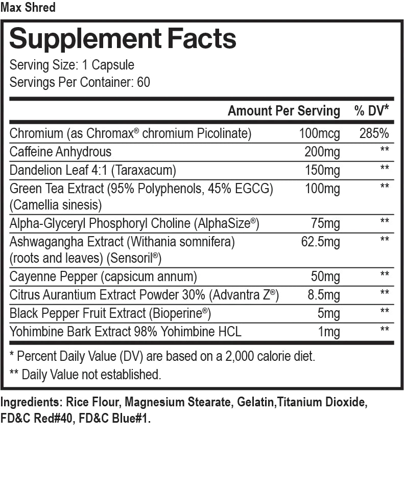 First, the craving-reducing power of Chromax® helps control your appetite and regulate your body's blood sugar levels. Then Advantra Z® and BioPerine® team up to bring the heat, increasing your metabolism and giving you an energy boost (without the jitters) to pull you through that mid-day slump. AlphaSize® carries you through your toughest workouts by increasing mental acuity, which promotes nervous system function and muscle movement, for an endurance-extending effect. Rounding out the dream team, Sensoril® tags in to level out the cortisol in your body, which reduces stress, boosts mood, and gives you the motivation you need to stick to your goals. MAX SHRED™ thermogenic accelerator is the launchpad you need to achieve your weight loss goals faster.