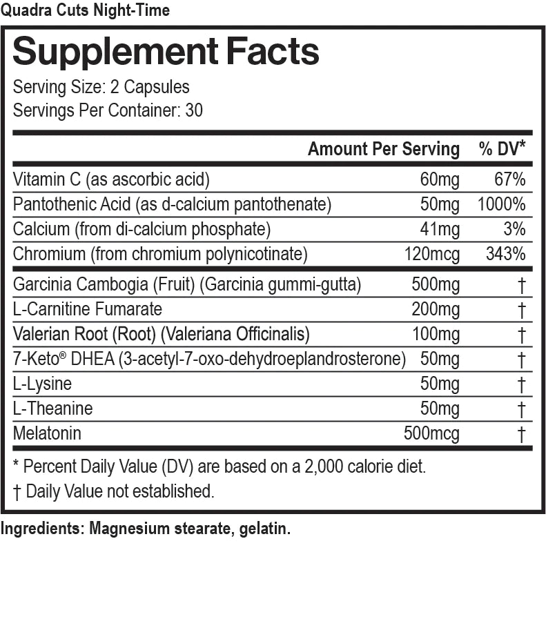 QUADRA CUTS NIGHT-TIME™ Metabolic Activator is designed for adults to help sustain maximum calorie burning while you sleep. Unlike preparations that leave you feeling overstimulated and restless in the evening, QUADRA CUTS NIGHT-TIME provides the fat burning factors throughout the night and assists you in sleeping by combining gentle, but effective sleep aids promoting a great night's sleep.