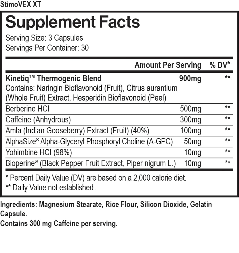 stimoVEX-XT™ is an innovative, extreme thermogenic and energy enhancing weight loss formula containing the highest quality and purest ingredients for effective results. The main thermogenic ingredients in stimoVEX•XT target the release, transport and burning of fat. Additional ingredients enhance energy, mental focus and clarity. stimoVEX•XT is driven by several patented and branded ingredients including Kinetiq™ Citrus Thermogenic Blend (contains standardized Citrus aurantium extract plus bioflavonoids Naringin and Hesperidin), Berberine, Amla (Indian Gooseberry) Extract, AlphaSize® Alpha-Glyceryl Phosphoryl Choline (A-GPC), and BioPerine® in addition to Caffeine, and Yohimbine. The stimoVEX•XT formula is designed to jump start fat and energy metabolism and based on published science to deliver positive results.†